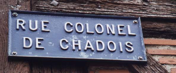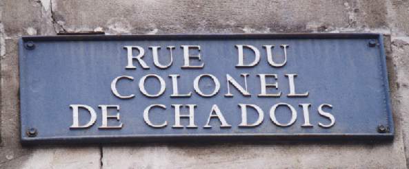 La monographie des places et des rues de Bergerac par Robert Coq (publication de la Shap, 1970) signale : rue du Colonel de Chadois. Les deux plaques semblent de la même époque, mais c'est la plaque "rue du Colonel de Chadois" qui pourrait être inexacte.